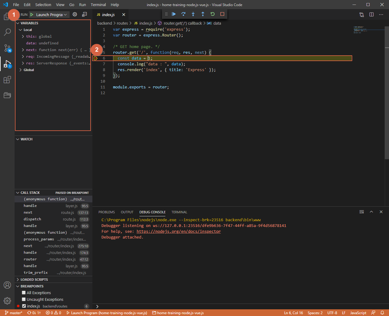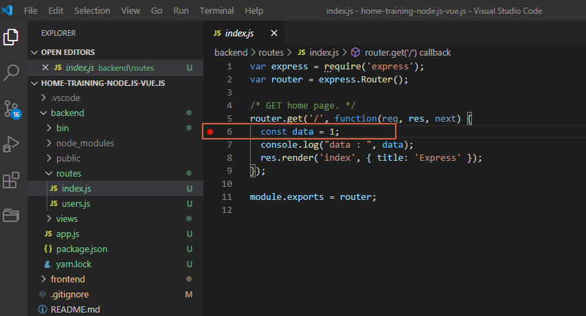 Express 기본 인덱스 페이지에 테스트 코드를 입력하고, 브레이크 포인트를 설정하도록 하겠습니다.