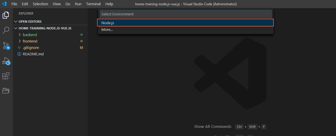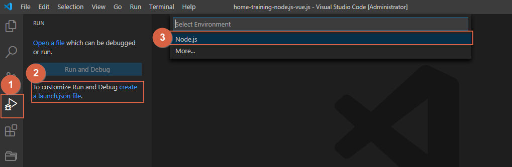 1.[F5] 키를 누르고, Select Enviroment에서 Node.js를 선택합니다.