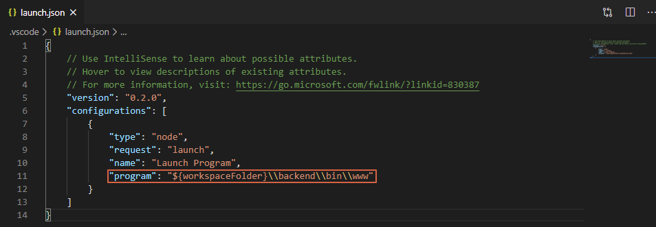 디버그 모드 설정 파일 생성 3. 생성된 launch.json에 내용 중 program 부분을 아래와 같이 수정합니다.