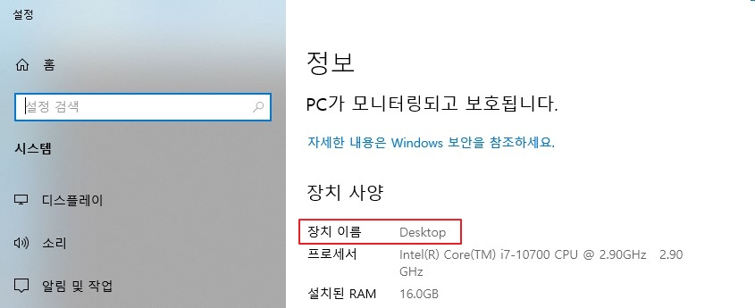 3. 장치 이름이 현재 PC 이름 (호스트 네임) 입니다.