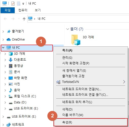 2. ⓛ 내 PC를 우클릭 후 ② 속성을 클릭합니다.
