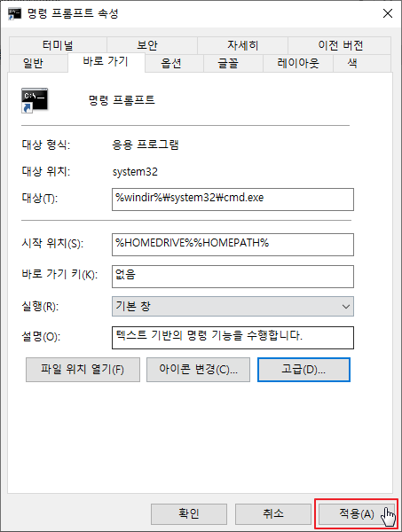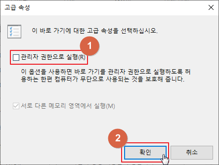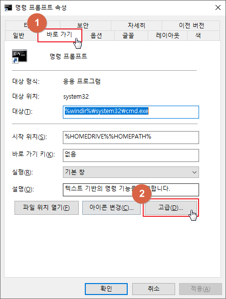 일반적인 바로가기 보다 탭이 많은 이유는 cmd.exe 이기 때문입니다. 3. ①[관리자 권한으로 실행] 을 체크하고 ②[확인] 버튼을 클릭합니다.
