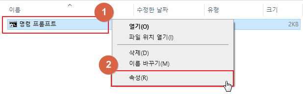 1. [Win] 키 또는 시작 버튼을 눌러 시작 메뉴에서 cmd 를 입력하여 나온 ①명령 프롬프트를 우측 클릭합니다. ②[파일 위치 열기]를 클릭합니다.