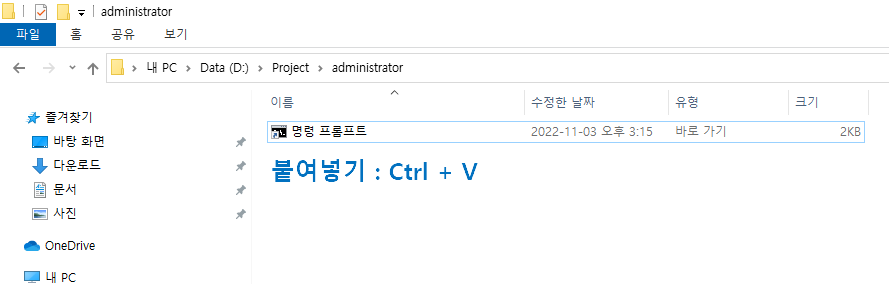 3. 2번에서 바로 가기를 복사한 경우 원하는 폴더에 붙여넣습니다. 붙여넣기 단축키 [Ctrl + V] (이미 바로 가기를 생성했으면 생략해도 됩니다.)