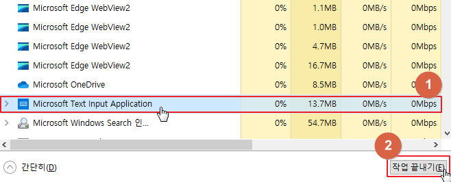 2. ①[Microsoft Text Input Application] 을 찾은 후 ②[작업 끝내기] 해주세요.