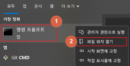 1. [Win] 키 또는 시작 버튼을 눌러 시작 메뉴에서 cmd 를 입력하여 나온 ①명령 프롬프트를 우측 클릭합니다. ②[파일 위치 열기]를 클릭합니다.