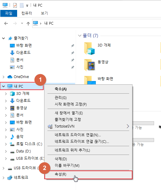 2. ⓛ[내 PC]를 우클릭 후 ②[속성]을 클릭합니다.